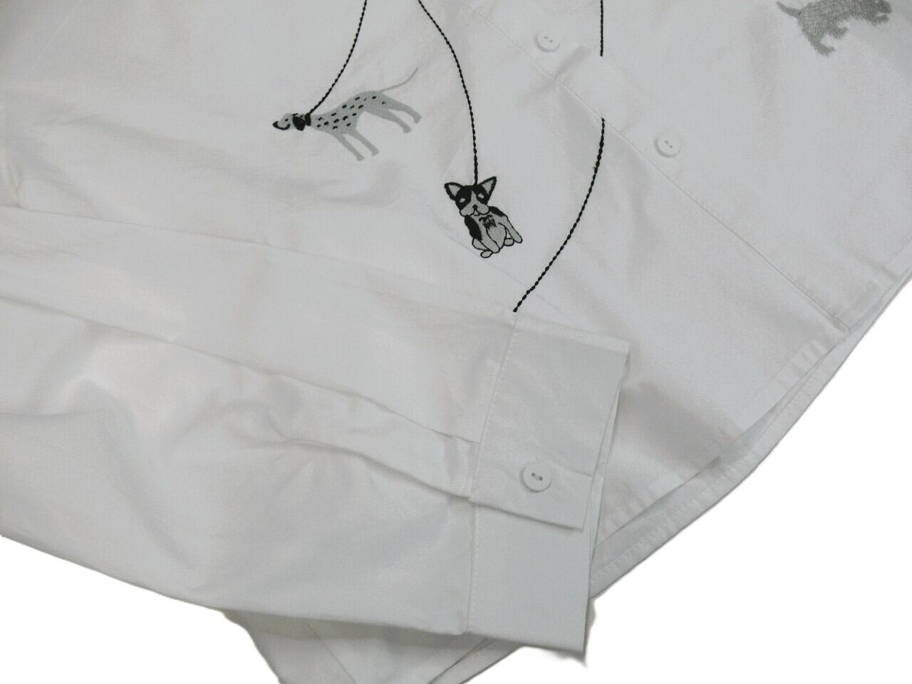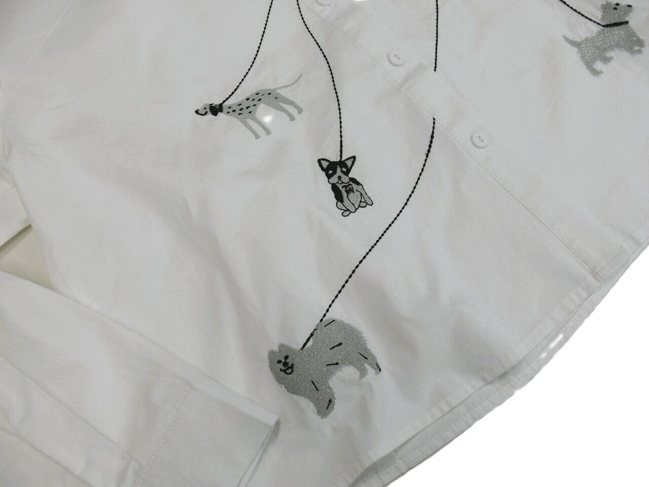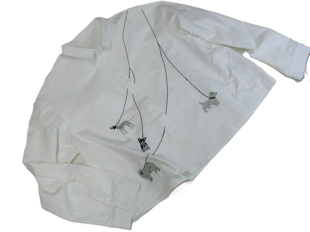 おしゃれなシャツカラーと可愛らしい刺繡デザインは、ワンちゃんをさらに魅力的に演出します。軽やかな素材感で、ブラウスはもちろん「はおり」として着用いただけるのもポイントです。前身頃にはさりげなく施された刺繡が、愛らしさとお洒落感をプラスしています。