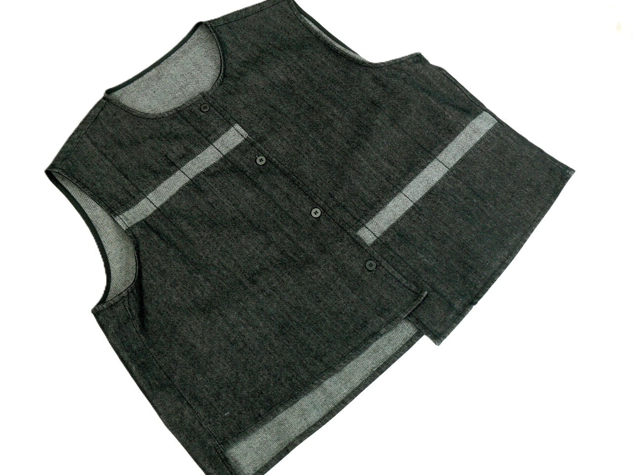遊び心満載のブリーチ加工が施されたデニムベストです。ユニークなイレギュラーデザインで、カジュアルなコーディネートにピッタリ。刺繡や素材切り替えのアクセントもおしゃれです。