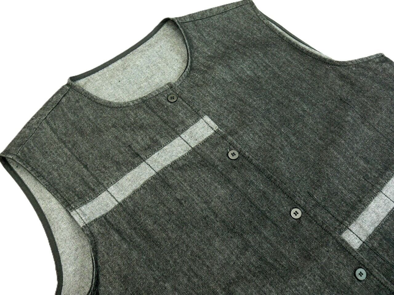 前身頃センターでのボタン開閉、ポケットはありません